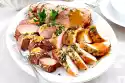 Mix paprika and oil. Coat the roast all around with it. Roast in the hot oven for about 30 minutes. Remove kitchen string. Arrange everything. Serve with a green salad.