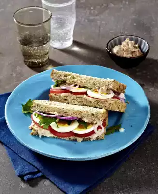 Spread 4 slices of toast with the tuna cream, place the tomatoes, eggs, onions and parsley on top, cover with the remaining slices of toast. Halve the sandwich and arrange on plates.