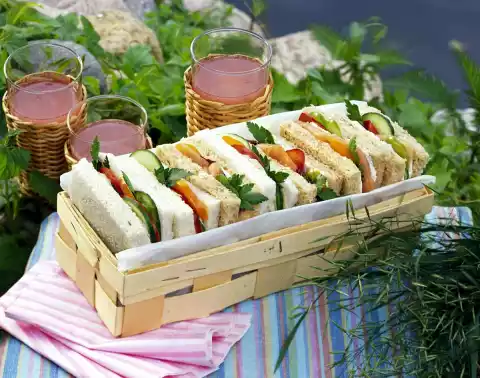 Clean and wash cucumber and bell peppers and cut into fine slices or rings. Wash parsley, pluck off leaves. Remove radicchio leaves from the stalk, wash and drain. Place salmon on the sandwich slices coated with cream cheese. Spread the remaining ingredients as desired on the coated sandwiches. Cover each sandwich with the appropriate slice of toast and wrap in foil for transport