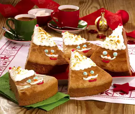 Remove the cake from the oven, remove from the edge of the springform pan and let it cool down on a cake rack. Mix icing sugar and lemon juice. Colour a small part of the icing with a few drops of red food colouring. Pour the icing into the freezer bags and cut off a small corner each. Cut the cake into 10 pieces. Decorate triangles with moustaches, eyes and noses and decorate with love beads. Let dry