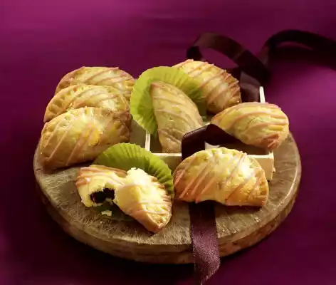 Roll out dough between 2 layers of baking paper 2-3 mm thick. Cut out the dough with a round cookie cutter (6 cm Ø). Cover each piece of dough with approx. 3 g of filling and carefully fold over and press together. Slightly press in the edges with a fork. Line 2 baking trays with baking paper. Whisk 1 egg yolk and 1 tsp. water. Spread a thin layer of ravioli and bake one after the other on the 2nd rack from above in a preheated oven (electric range: 175 °C/ convection oven: 150 °C/ gas: level 2) for 10-12 minutes. Remove the ravioli from the oven, allow to cool briefly (approx. 5 minutes), then place on a cake rack and allow to cool