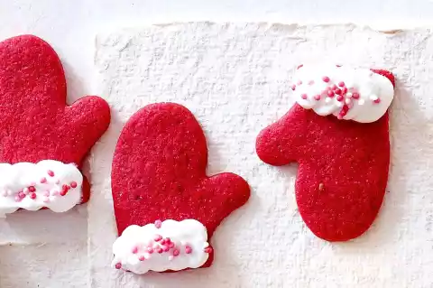 Roll out dough in portions on a lightly floured work surface to a thickness of approx. 4 mm, cut out gloves. Place on the trays and bake in a hot oven for 6-7 minutes, one after the other. Remove the cookies and decorate with beaten egg white and sugar pearls. Bake for about 2 minutes at the same temperature. Let them cool down.