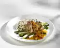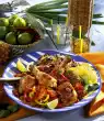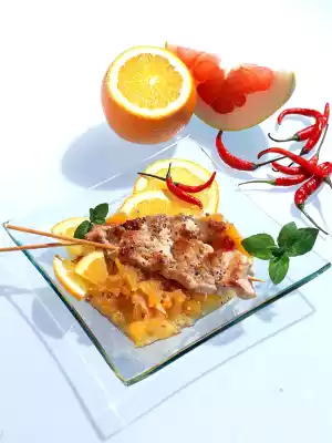 Core and chop the pods. Put fruit fillets, onions and chillies in a pot. Add mustard seeds, sugar, salt and vinegar and bring to the boil while stirring. Let it boil down in an open pot at high heat for about 20 minutes. Stir several times in between. Let the chutney cool down. Dab the cutlets dry and cut them lengthwise into approx. 2 cm wide strips. Place meat on shish kebab skewers and fry in hot oil on both sides for 2-3 minutes. Season with salt and pepper.