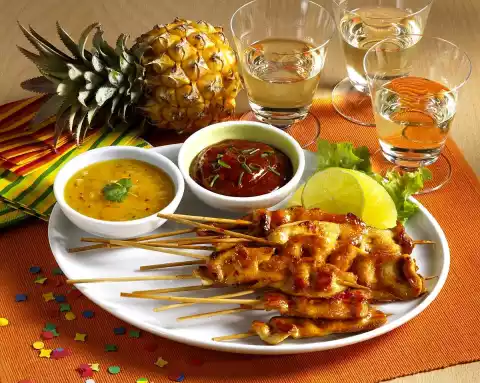 Pour into a bowl and garnish with the remaining spring onions. Remove meat and cut lengthwise into approx. 24 thin slices and place them on wooden skewers in a wavy shape. Heat oil in a pan. Fry the skewers in it in portions on each side for about 2 minutes. Season with salt and coat with chilli sauce. Arrange the sauces with the skewers on a plate. Garnish with salad, pineapple and lime slice