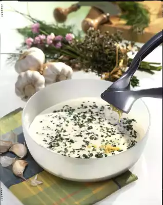 Stir the herbs into the cream. Peel the garlic and press it into the cream using a garlic press. Season to taste with salt, pepper and sugar. Pour the sauce over the prepared noodles or vegetables