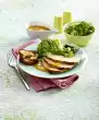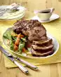 Remove meat from the roaster and keep warm. Pour sauce through a sieve. Add cranberries and jelly, bring to the boil, stir in sauce thickener and simmer at low heat for about 1 minute. Season sauce with salt and pepper. Cut the roast open, arrange on a plate with some sauce and carrots. Add the dumplings and the rest of the sauce
