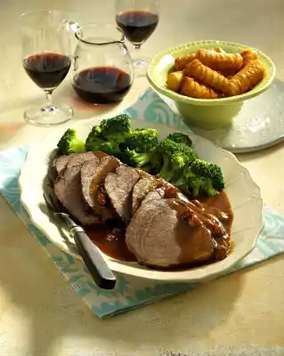 After about 1 hour crumble pumpernickel and add. Remove the roast from the sauce. Strain the sauce through a sieve and put it back into the casserole with the roast. Wash and drain the raisins and add to the roast. Cover and cook for another 30 minutes. Clean the broccoli, remove the florets from the stalk, wash and cook in boiling salted water for 5-7 minutes. Melt butter. Pour broccoli into a sieve and drain. Season sauce with salt, sugar and pepper. Cut meat into slices and arrange on a plate with broccoli. Cover meat with the sauce. Spread liquid butter on the broccoli. Serve with croquettes
