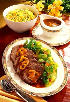 Clean, wash and slice the mushrooms. Sauté in the remaining butter. Remove the roast, pour the roast stock through a sieve to the mushrooms and bring to the boil. Stir in the sauce thickener, bring to the boil again and season with salt and pepper.