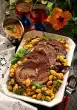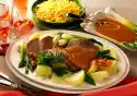 Add the marinade and braise at low heat for 1 1/4 hours. Clean and wash the Brussels sprouts and cook in salted water for 20 minutes. Wash, quarter, core and cut apple into pieces. Heat 10 g butter in a saucepan and sauté the apples briefly in it.