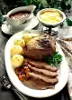 Drain the Brussels sprouts and mix with the apple slices. Season with nutmeg. Cut the meat open and arrange on a plate with the sauce and the Brussels sprouts. Garnish with parsley. The rest of the sauce is extra.