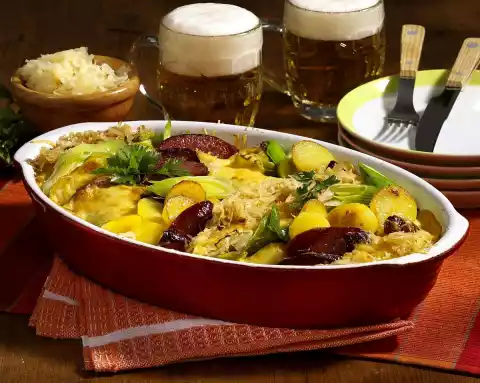 Cut the potatoes into slices. Spread half of the mustard sauce on the bottom of an ovenproof dish. Layer sauerkraut, potatoes, leek and cabanossi like roof tiles. Pour the rest of the sauce over it.