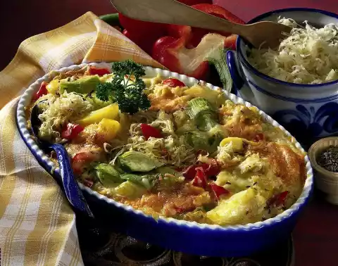 Add the leek, peppers and potatoes and braise for about 10 minutes. Mix sour cream and eggs and season with salt and pepper. Fill the sauerkraut into a casserole dish, pour the sour cream and egg icing over it and sprinkle the cheese on top.