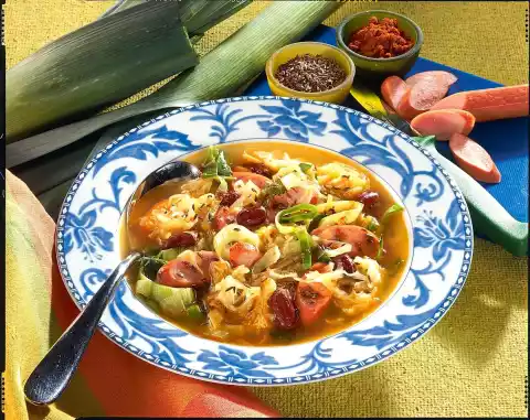Roughly chop the sauerkraut and sauté. Season with caraway and paprika. Pour on broth, bring to the boil, cover and cook for about 10 minutes. Add beans and sausages and cook for another 5 minutes. Season sauerkraut soup with salt and pepper and serve