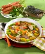 Peel and finely dice the onions. Clean, wash and cut the leek into rings. Drain the beans on a sieve. Cut the sausages into slices. Heat oil in a pot. Brown the onions and leek in it.