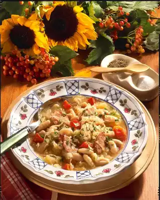 Add sauerkraut and stock. Pour beans on a sieve, rinse and add to the sauerkraut. Bring everything to the boil and cook for 25 minutes. Add slices of sausage shortly before the end of cooking time. Season to taste with salt and pepper. Wash and chop parsley and sprinkle over the sauerkraut-bean stew