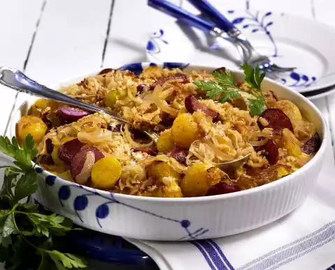 Stew the sauerkraut in the frying fat for about 5 minutes. Season to taste with salt and pepper. Take out and fill with the remaining ingredients into a greased large casserole dish