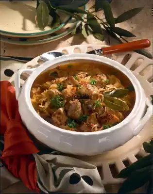 Return all meat to the pot. Add the onions and fry. Season with salt, ground pepper and bay leaf. Dust with flour. Sweat it vigorously and deglaze with white wine and 1/2 litre water. Cover and let it stew for about 30 minutes. Then pull the sauerkraut apart and fold into the meat. Add another 1/2 litre of water. Lightly crush the allspice and add with the caraway.