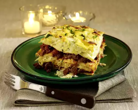 Fry the minced meat in it until crumbly. Add onion and tomato paste and fry briefly. Add stock and tomatoes, bring to the boil. Season with pepper and paprika and simmer for about 5 minutes. Grease an ovenproof dish (25 x 30 cm). Put 4 lasagne plates in the baking dish, add half of the sauerkraut. Cover with 4 lasagne plates. Add the chopped mass. Place another 4 lasagne sheets on top, spread the rest of the sauerkraut on top. Sprinkle with cheese. Bake in the preheated oven (electric cooker: 175 °C/ convection oven: 150 °C/ gas: level 2) on the 2nd rack from below for approx. 45 minutes.