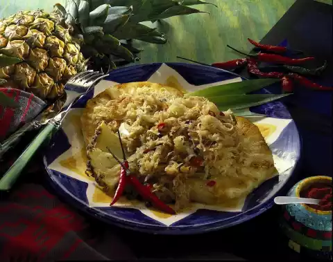 Spread the sauerkraut over it. Garnish as desired with pineapple leaves and chilli peppers.