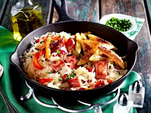 Add onions and paprika and fry for about 3 minutes. Add the sauerkraut to the pan and fry for another 3-4 minutes. Season to taste with salt and pepper.