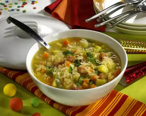 Add potatoes and onion and fry for another 3 minutes. Add stock, bring to the boil and cook for 15 minutes. Clean and wash spring onion and cut into rings. Add sauerkraut, spring onions and apple juice to the stock and cook for another 5 minutes.