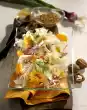 In the meantime, slice the Gouda into thin slices. Season the salad with salt, pepper and sugar. Put it on a plate. Arrange ham and cheese on the salad. Garnish with thyme.