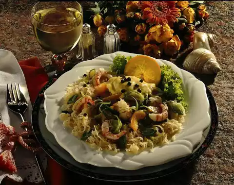 Clean the leek, wash it and cut it into very fine rings. Drain the apricots and collect 2 tablespoons of juice. Cut the apricots into thin slices. Wash the shrimps, drain them. Mix leek, apricots, shrimps, sauerkraut, orange and apricot juice.