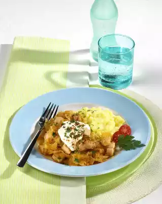 Onions peel, finely dice. Dice the turkey breast as well. Slightly fry in hot oil in a pot all around, remove. Sauté onions in the frying fat. Add sauerkraut, bay leaf and sweet paprika and fry. Add turkey breast again. Deglaze with apple juice, season with salt and pepper. Bring to the boil, cover and braise at low heat for 15-20 minutes