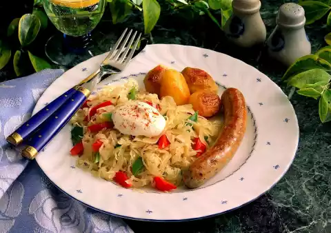 Cook for another 3 minutes. Fry the potatoes in the remaining oil. Arrange sausages, potatoes and sauerkraut on a plate. Dust sour cream with paprika and put it on the sauerkraut