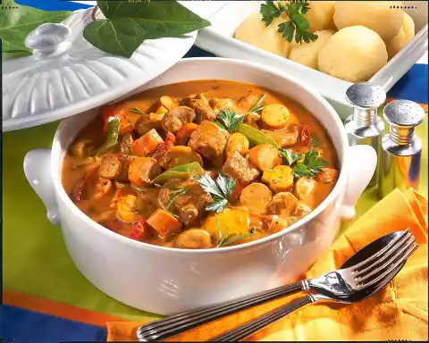 In the meantime stir dumpling powder into 3/4 litre cold water, let it swell for 10 minutes. Form about 12 dumplings with moistened hands. Put them into plenty of boiling salted water. Let it simmer at low heat for about 20 minutes. Refine goulash with cream. Cut the sausages into slices and heat them up. Season to taste again. Serve everything garnished with parsley and rosemary