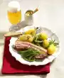 Deglaze the sausage pan with a cup of cream and bring to the boil. Add the dill. Stir in the sauce thickener and let it simmer a little longer. Wash, dry and halve the lemon. Squeeze half of it, the other half in slices, quarter them.