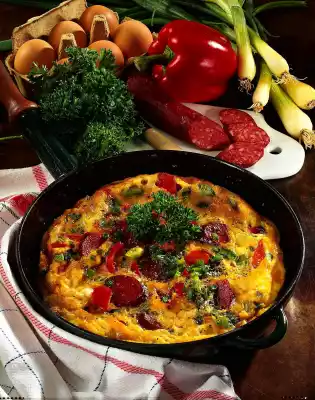 Clean, wash and cut the spring onions into rings. Peppers clean, wash and cut into pieces. Cut sausage into slices. Put eggs in a mixing bowl, whisk, stir in the milk and season with salt, pepper, nutmeg and paprika.