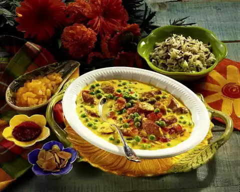 Defrost the peas. Wash, quarter and seed the tomatoes. Cut the flesh into small cubes. Cut sausages diagonally into pieces. Peel and finely chop onions. Heat the fat. Sauté onions in it, take out. Fry the sausages for about 2 minutes, turning them over. Dust with curry and remove from the pan. Sweat flour in the frying fat, add milk while stirring constantly, bring to the boil. Heat peas and sausages in it. Season with crème fraîche, salt and pepper. Serve dusted with curry. Serve with a wild rice mixture, roasted almond flakes, diced apricots and Sambal Oelek
