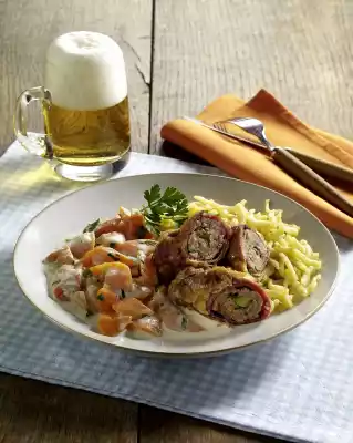 Add to vegetables, keep warm. Heat 2 tablespoons of oil in a pan. Fry the spaetzle for about 5 minutes while turning. Arrange sausage rolls, carrots and spaetzle on plates. Garnish with parsley.