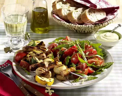 Grill skewers for 4-5 minutes. Wash and clean the rocket and drain well. Mix the rocket with the tomato salad. Serve sausage skewers with tomato salad and dip. Bread tastes good with it.