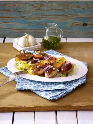 Onions peel, in columns cut. Cut pretzel sticks and sausages into 1-1.5 cm thick slices. With onion slices alternately put on skewers. Peel garlic, chop finely. Mix with 4 tablespoons of oil and oregano