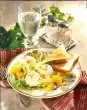 Add stock and vinegar to the potatoes. Let the salad steep for a short time. Wash and chop the parsley. Wash and halve the tomatoes. Wash, clean and slice the cucumber. Mix yoghurt and mayonnaise, season with salt and pepper.