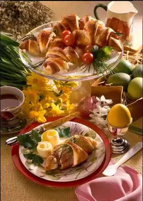 Place the croissants on a baking tray lined with baking paper. Brush with whisked egg yolk. Bake in the preheated oven (electric cooker: 200 °C/ convection oven: 175 °C / gas: level 3) for 12-15 minutes