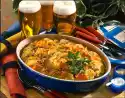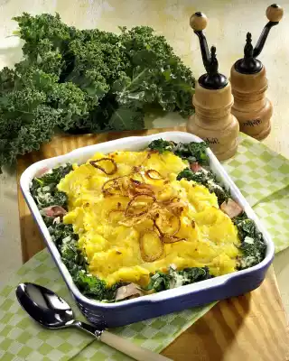 Melt 20 g fat. Sauté flour in it, deglaze with 1/4 litre milk and simmer for about 5 minutes. Stir in mustard, season with salt and pepper. Cut ham into thick strips. Add sauce and ham to the kale, fold in and fill into an ovenproof dish. Drain the potatoes, add 1/4 litre of milk and mash into mashed potatoes. Season to taste with salt, pepper and nutmeg. Add mashed potatoes to the kale. Spread 20 g fat in flakes on top. Bake in the preheated oven (electric cooker: 200 °C/ convection oven: 175 °C/ gas: level 3) for about 10 minutes.