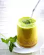 Finely puree milk, avocado, coriander, except for something to garnish, chilli cubes and lime juice. Season to taste with salt and ##tabasco##. Arrange in glasses and garnish with chilli, ##coriander## and Tabasco.