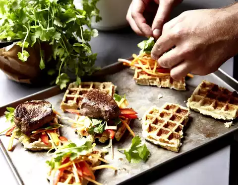 Remove from the waffle iron and keep warm. Arrange the waffles. Arrange carrot and pepper strips, spring onion rings and coriander on top, place meat on top and sprinkle with coriander oil.