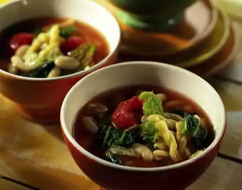 Cook the pasta in boiling salted water for about 10 minutes. In the meantime, drain the beans, rinse with cold water and drain. Clean, wash and cut cabbage into strips. Put them into a pot. Pour on broth.