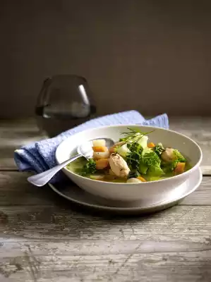Heat the oil in a large pot. Briefly sauté the carrots and savoy cabbage in it. Approx. 1 1⁄4 Pour in l water, stir in broth, bring to the boil. Cut black salsifies into thick slices. Add the caraway seeds to the stock and simmer everything for about 15 minutes.