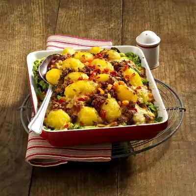 Add stock and cream while stirring constantly and bring to the boil. Season to taste with salt and pepper. Grate cheese and stir into the sauce. Spread the savoy cabbage in an ovenproof dish. Add potatoes, minced meat and sauce alternately. Bake in a preheated oven (electric cooker: 175 °C/ convection oven: 150 °C/ gas: level 2) for approx. 30 minutes