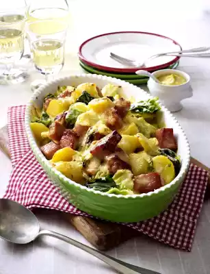 Roughly dice the cured pork. Heat the oil in a frying pan and fry the smoked pork in it for about 5 minutes, turning. Coarsely grate the cheese. Rinse potatoes under cold water, drain, peel and slice. Place the savoy cabbage, cured pork loin and potatoes in a greased casserole dish. Spread béchamel on top and sprinkle with cheese. Bake in a preheated oven (electric cooker: 200 °C/ convection oven: 175 °C/ gas: level 3) for approx. 30 minutes