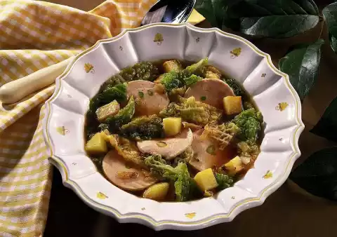 Stir in tomato paste and add stock. Add the savoy cabbage, bring everything to the boil, cover and cook for 15 to 20 minutes. Five minutes before the end of the cooking time, add the sausage to the soup and bring to the boil. Season to taste with salt, pepper and nutmeg