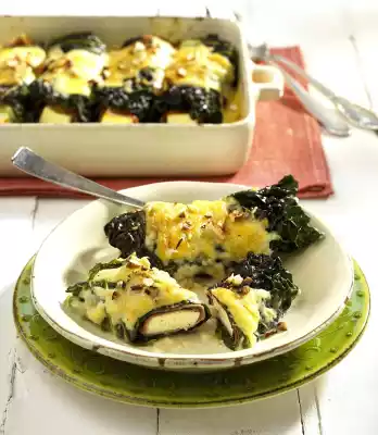 Cut the thick vein of the leaf flat. Cut the feta into 8 equal-sized sticks. Place a slice of ham and a piece of feta on each cabbage leaf and roll up. Place in a flat casserole dish with the seam facing down.