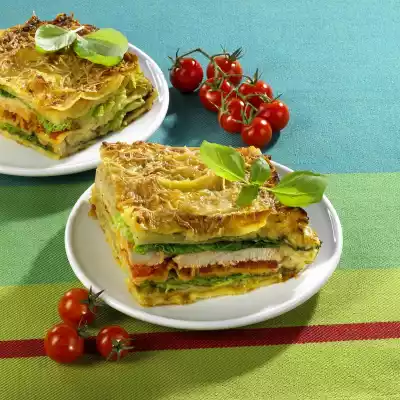 Add stock and cream while stirring constantly, bring to the boil. Season to taste with salt, pepper and nutmeg. Fill a square casserole dish (approx. 20x20 cm) alternately with lasagne plates and prepared ingredients. (sauce, pasta, sauce, savoy cabbage, sauce, noodle, sauce, tomato, chicken fillets, sauce, savoy cabbage, sauce, pasta, sauce). Sprinkle with grated parmesan. Bake in the preheated oven (electric cooker: 200 °C/ gas: level 3) for about 40 minutes. Serve garnished with basil as desired