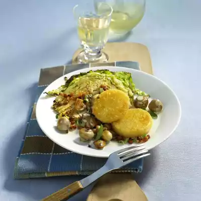 Clean savoy cabbage, cut out stalk. Cut cabbage into thin slices. Heat 3 tablespoons of oil in a frying pan and fry the savoy cabbage in portions for about 4 minutes while turning. Take out the savoy cabbage and in the same pan crisp out the bacon, add the mushrooms and fry for about 3 minutes. Deglaze with cream and stock, bring to the boil and put the savoy cabbage back into the pan. Season to taste with salt, pepper, nutmeg and marjoram, leave some to garnish. Remove the dumplings from the water, rinse with cold water and carefully remove from the cooking bags. Cut dumplings into 3 slices each. Heat 2 tablespoons of oil in portions in a large pan and fry the dumpling slices one by one for about 4 minutes each.