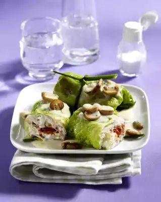 Clean and clean the mushrooms and cut them into slices. Peel and finely chop the onion. Drain rice and let it drain. Stir cream cheese until smooth, season with pepper, mix in rice. Dab the savoy cabbage leaves dry and place a slice of smoked pork loin in the middle of each leaf.